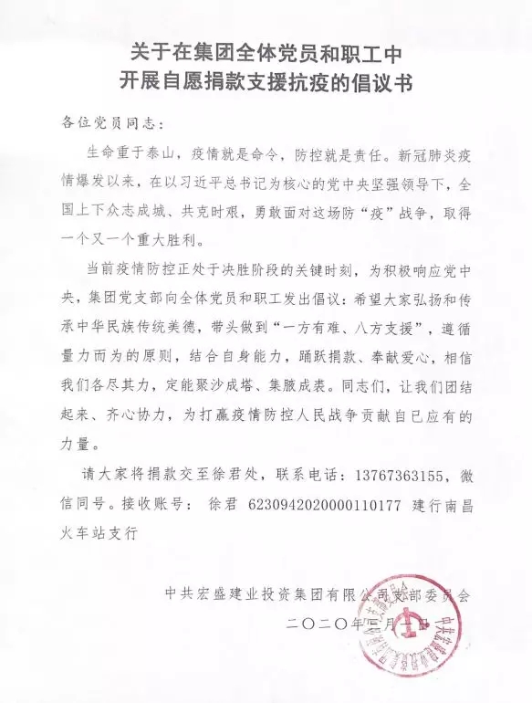 “抗擊疫情當(dāng)先鋒,身體力行作表率”。在疫情面前,以集團(tuán)董事長周金虎、副董事長周金旺同志為代表的一大批共產(chǎn)黨員,挺身而出,力求作為,截止目前,宏盛建業(yè)已從全國和海外采購了價(jià)值340多萬元的醫(yī)療防護(hù)物資,用于無償捐贈(zèng),為上饒市、新余市、宜春市、宜賓市、巴中市、四川涼山州,上海等市轄區(qū)的相關(guān)單位抗疫出力,出資近百萬元無償援建上饒市負(fù)壓病房和醫(yī)療廢物暫存站2個(gè)抗疫項(xiàng)目。